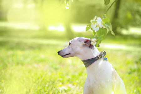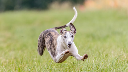 greyhound dog runs on the lawn. Whippet plays on grass. Active pet