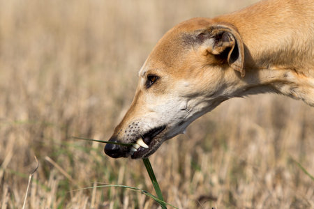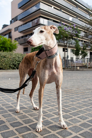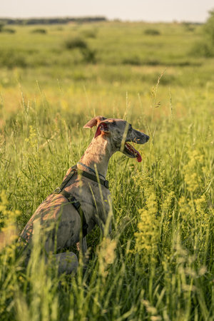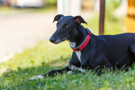 Purebred dog greyhound is resting outdoors in hot summer day. Spanish galgo.