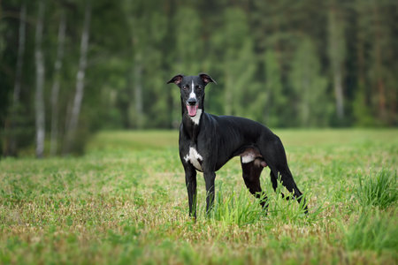 Dog looking towards some trees. Greyhound breed with a coat in a forest.