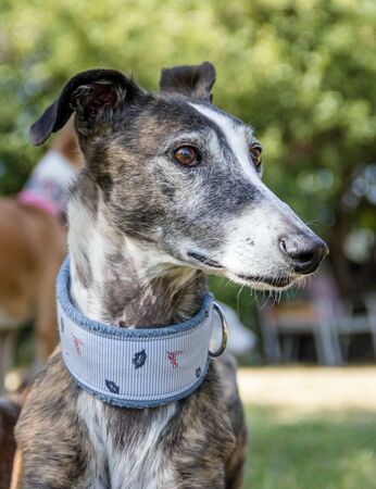 Portrait of a grey whippet a short hair dog. Vertical shot.