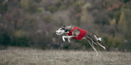 Greyhound jumping through air in red vest during lure coursing training. Concept of animal agility, speed control, focus, fitness routine, and outdoor discipline.