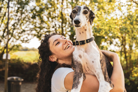 Greyhound and female pet owner. Selective focus on dog. Spanish galgo looking away. Woman and her dog during walk in forest at autumn