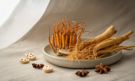 Dried cordyceps mushrooms and ginseng roots arranged on a ceramic plate, accompanied by lotus seed slices and star anise. essential ingredients for traditional chinese medicine and natural health remedies.