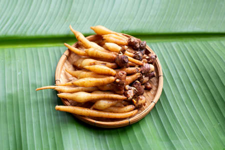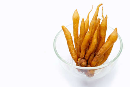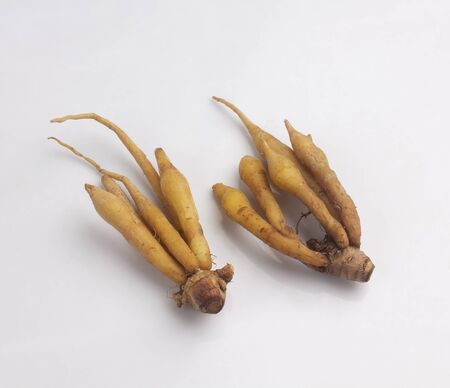 Fresh Kaempferia vegetables and herbs isolated on white background closeup.