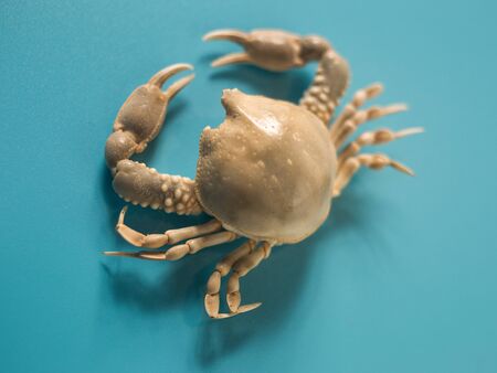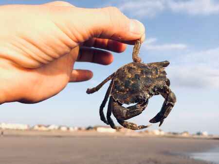A brown north sea crab crustacean in the palm of a woman hand. edible shellfish marine life. Seaside food chain and cuisine. Fantastic crab claw fresh crab meat.