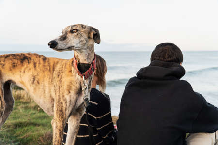 Young blonde woman and her boyfriend and her greyhound on the shore