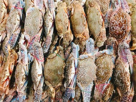 Blue crab (Portunus pelagicus)crab, Female blue swimmer crab with eggs in fisherman's hands on sea background.