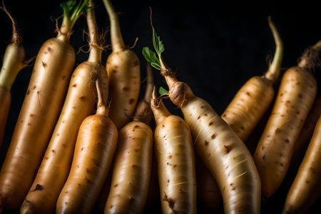 ?The camera is zoomed in on parsnips, which are placed on a dark background in a studio.. AI Generated
