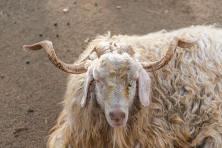 north mountain wild goat with brown fur and big horns stand at green highland valley. wildlife concept