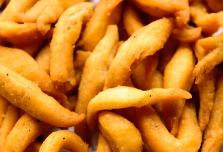 Close up Delicious Salty Spicy Namkeen Bhujia snack Texture. Spicy fried snacks. Abstract food background.