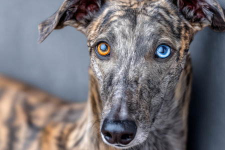 Elegant Greyhound with Striking Heterochromia Eyes Posing Gracefully Against a Soft Gray Background