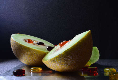 pieces of ripe melon and multi-colored candy and multi-colored candy