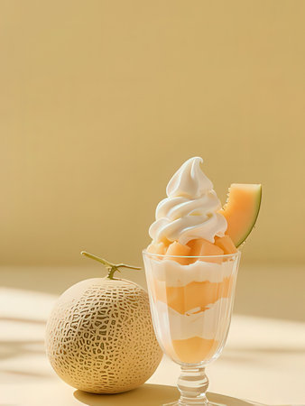 Melon and ice cream in glass on beige background with shadows