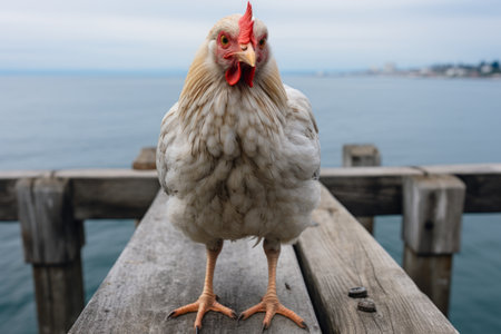 a white and red rooster standing on a wooden pier