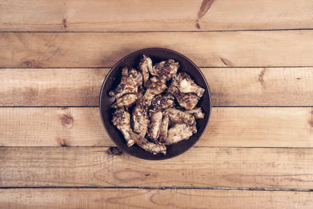 Fried chicken wings in clay plate on wooden table