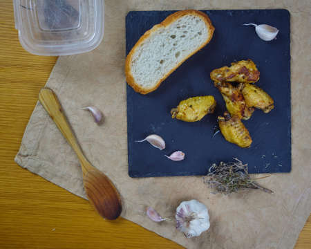 Garlic Chicken Wings. Spanish Tapa dish served with crusty bread and its ingredients on a black slate board. Top View