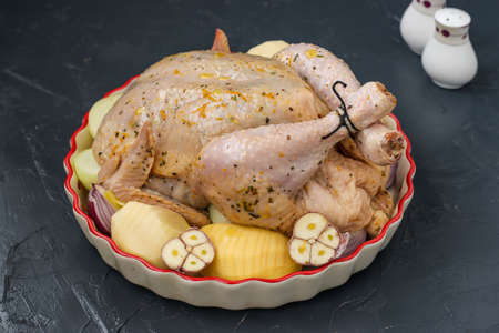 Raw chicken in a ceramic form in an orange-honey marinade with potatoes is preparing for baking in the oven, dark background, horizontal orientation