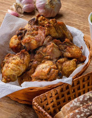 Fried chicken wings. A dish for preparing dinner for beer or wine at home. Selective focus. Background