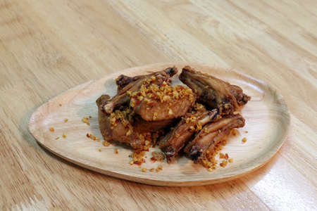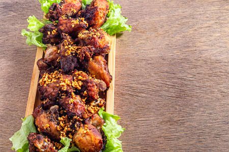 Fried chicken wings with garlic, With crispy garlic chicken wings on Dishes, trays, Wood, Fried foods