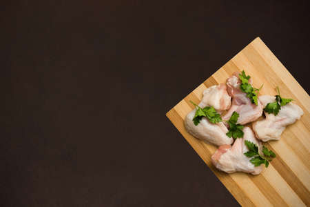 Raw chicken wings on a cutting board and a dark countertop. Top view.
