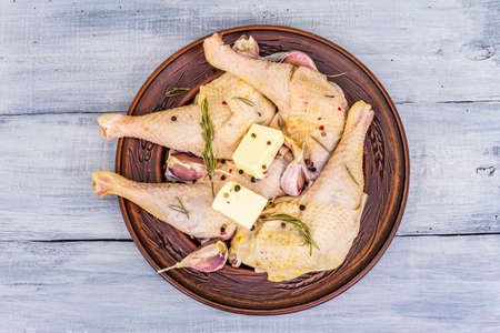 Raw chicken legs. Fresh BIO ingredient for preparation traditional food. Spice, vegetable, herbs, butter. Animal proteins and healthy fats, ceramic plate, wooden background copy space top view