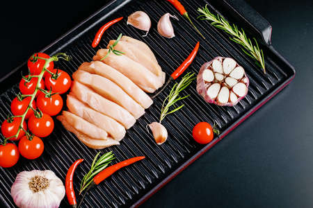 Chicken fillet with spices on dark wooden kitchen table. Top view with copy space.Chicken fillet on a grill pan with spices and vegetables on a dark background. Raw chicken meat cut into pieces for cooking.