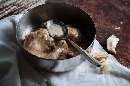 Stew Chicken in a Creamy Milk Sauce with Garlic in a Metal Bowl. White Towel with Spoon. Rustic Style