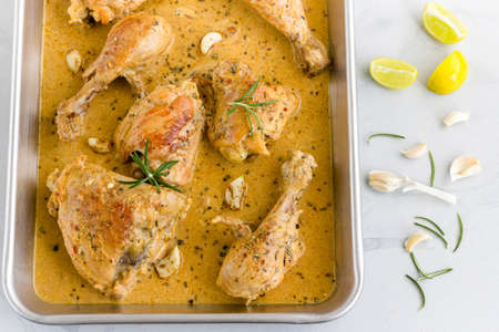 Creamy Garlic Butter Baked Chicken Garnished with Rosemary, Garlic and Lemon Top Down Horizontal Photo