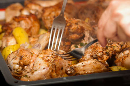 Chicken baked in the oven with spices, lemon, herbs and young potatoes.