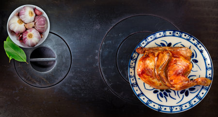 A top view of a plate with roasted chicken, bay leaves, and a bowl of garlic on a wood stove