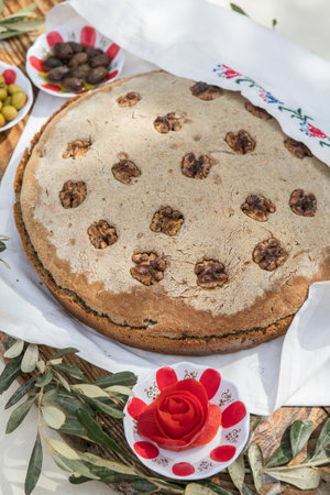 Traditional italian focaccia bread with walnuts and olives
