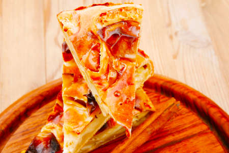 sweet food : apple pie cuts served on wooden plate over table with cinnamon sticks