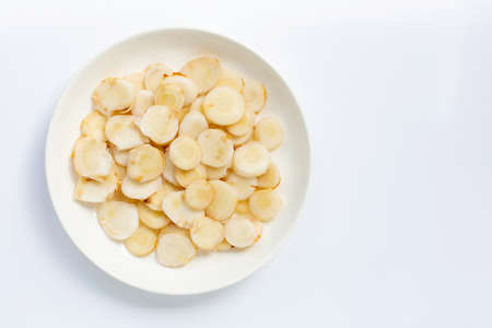 Fresh galangal root with slices isolated on white background with clipping path. Top view with copy space for your text. Flat lay