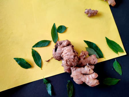 One Large piece of Ginger surrounded with curry leaves on a yellow background. Selective focus