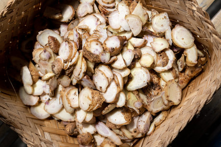 Fresh galangal slices in white bowl on wooden bamboo threshing basket background. Top view