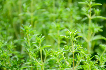 Savory plant in vegetable garden. Organic fresh herb. Satureja Hortensis herb plant. Countryside garden. Agriculture in the village.