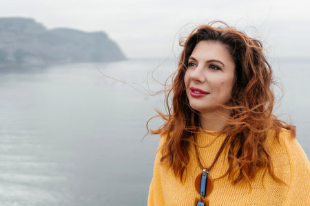 Portrait windswept hair happy woman against a backdrop of mountains and sea. Daylight illuminates the tranquil outdoor setting