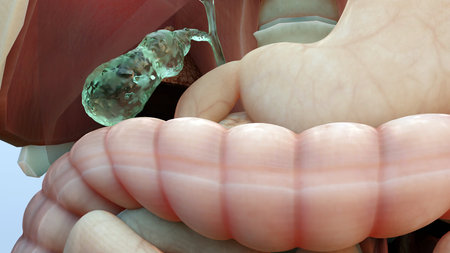 Gallstones in the gallbladderand bile duct, human silhouette and anatomy of surrounding organs, liver and gallbladder with stones, Realistic 3D Render