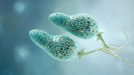Microorganisms with complex cellular structures and flagella are actively swimming and replicating, symbolizing cellular division, viral propagation, and various biological processes