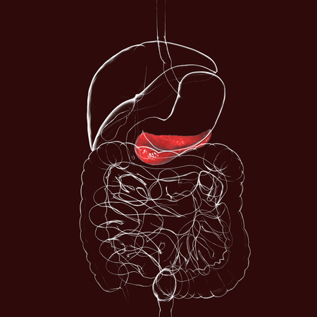 Human pancreas anatomy, 3D illustration showing organs of digestive system with highlighted pancreatic gland