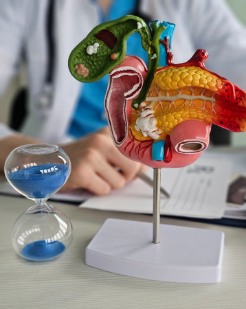 Doctor reviewing a colorful anatomical model of the pancreas with medication on a table in a clinic