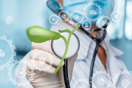 Gallbladder diagnosis and treatment concept. The doctor listens to the gallbladder on a blurred background.