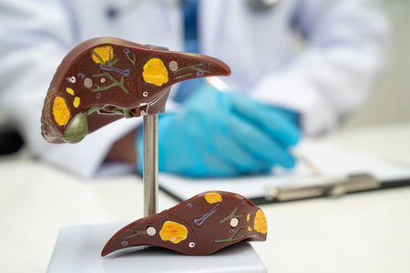 A doctor with a model of the human liver anatomy. Liver cancer and tumors, jaundice, viral hepatitis A, B, C, D, E, cirrhosis, liver failure, liver enlargement, hepatic encephalopathy, ascites, abdominal fluid, and health