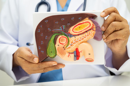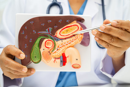 Treatment of gallbladder diseases and cholelithiasis. Doctor demonstrations gallbladder on anatomical medical model for analyzing and treating gallbladder disease