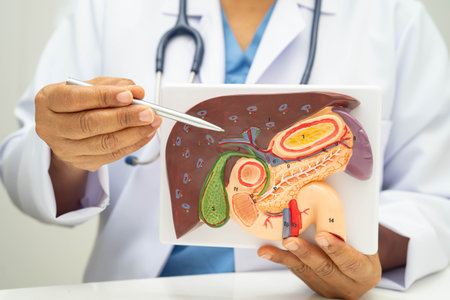 Pancreatitis, pancreatic cancer, Asian doctor with pancreas, gallbladder and bile duct human anatomy model at hospital.