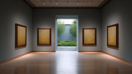Stunning interior view of an art gallery featuring framed paintings displayed elegantly against soft lighting, evoking tranquility and sophistication.