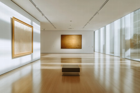 This art gallery showcases minimalist design, emphasizing large golden artworks illuminated by natural light streaming through large windows.