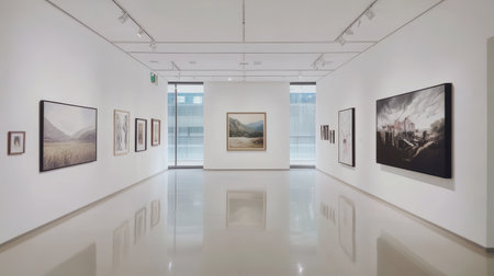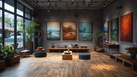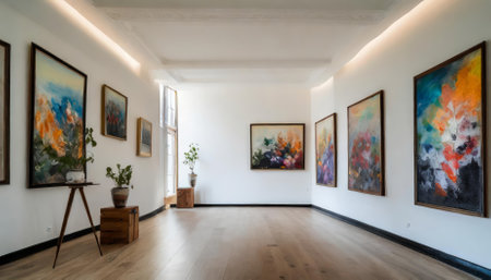 This captivating image captures a beautifully designed art gallery where stunning paintings are displayed against minimalist white walls, fostering a tranquil ambiance that celebrates creativity