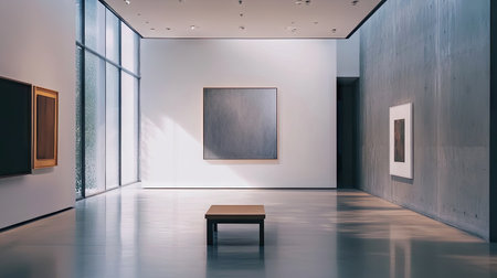 A spacious minimalist art gallery featuring natural light, simple decor, and modern artwork. The serene environment invites reflection and appreciation of creativity.