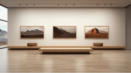 art gallery interior with pictures on wall and wooden floor, 3d rendering